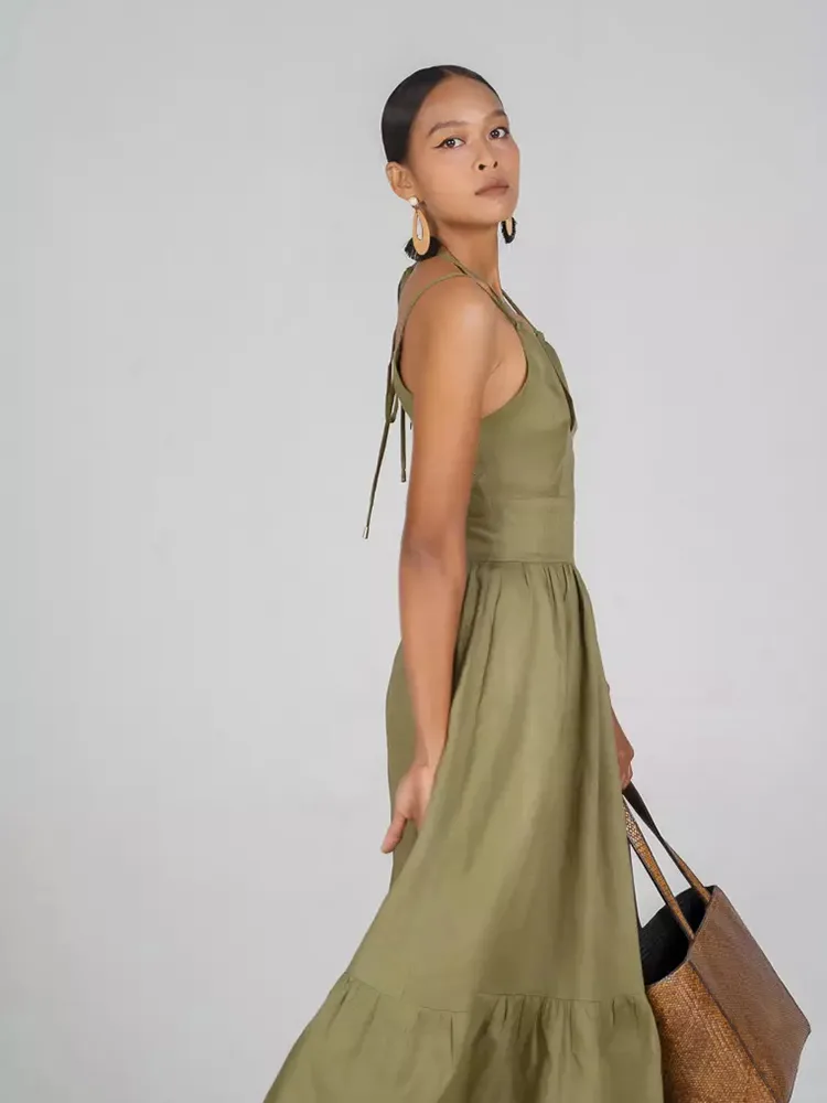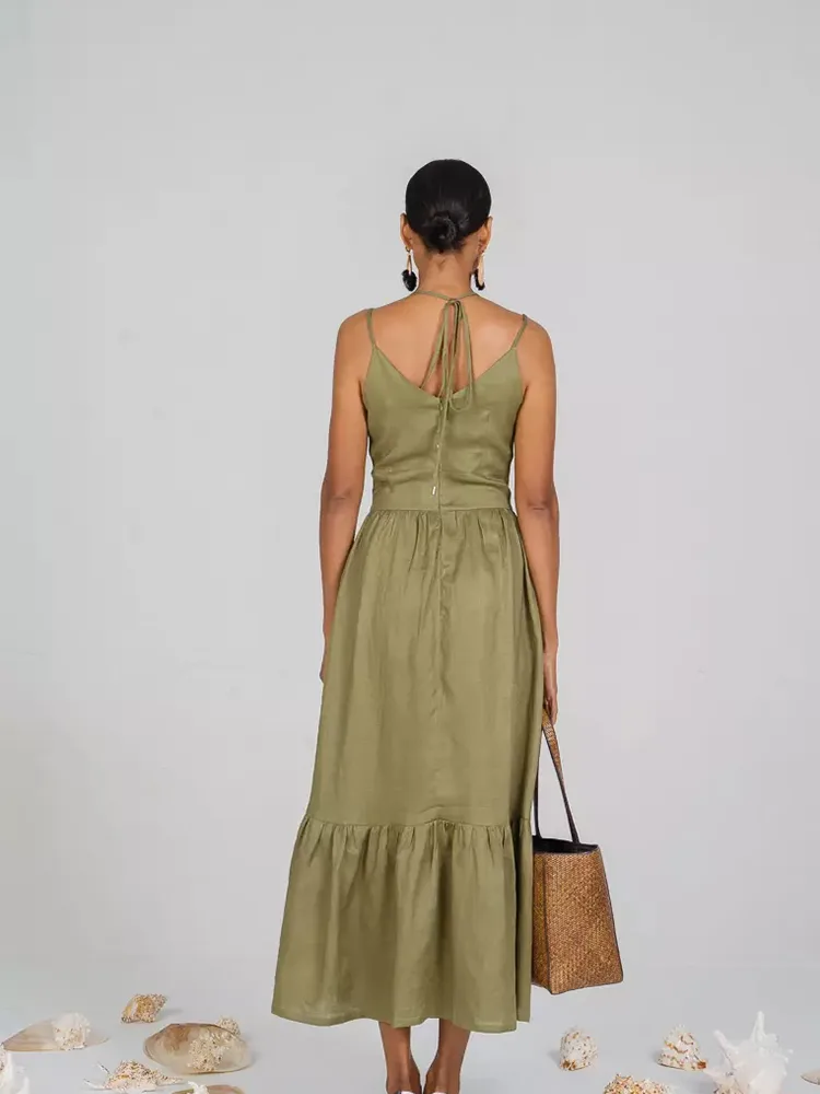 Mga Detalye ng Lady Deep V Neck Long Casual Linen Dress